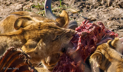 Zij hadden waarschijnlijk ook wel trek, maar moesten rustig afwachten tot mijnheer genoeg gegeten had. Vooral de welpen waren heel beweeglijk, wat weer reacties opriep van de dames leeuw, natuurlijk. Ze lagen dan weer even hier, dan even daar en liepen aan alle kanten om de auto heen. Wij wilden, dat we ogen (en camera's) van voor, van achter en opzij hadden; aan alle kanten was wat te zien!!